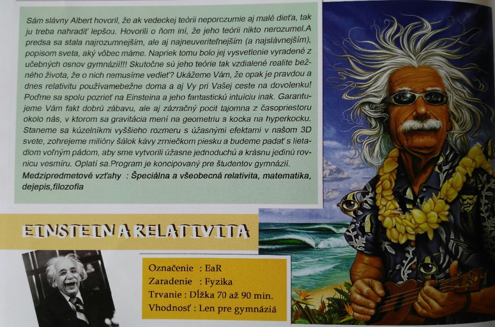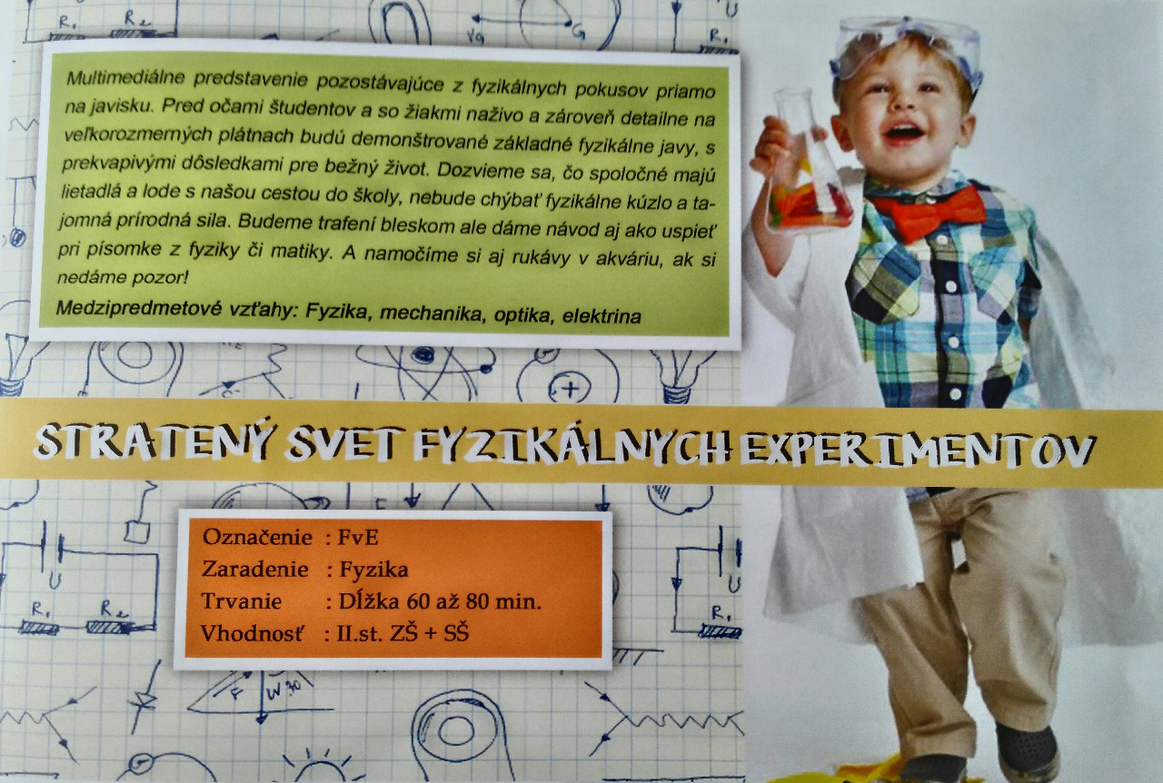 Stratený svet fyzikálnych experimentov predstavenia sa zúčastnili žiaci tercie a kvarty. Priamo pred očami žiakov boli demonštrované základné fyzikálne javy, s prekvapivými dôsledkami pre bežný život. Einstein a relativita predstavenia sa zúčastnili septimami a oktaváni. Jednoduchou, zábavnou formou prednášajúci porozprával s využitím 3D efektov ako sa z časopriestoru gravitácia mení na geometriu a kocka na hyperkocku. Žiaci boli nadšení a aktívne sa zapájali do procesu, a za svoje správne odpovede získali hodnotné ceny.
